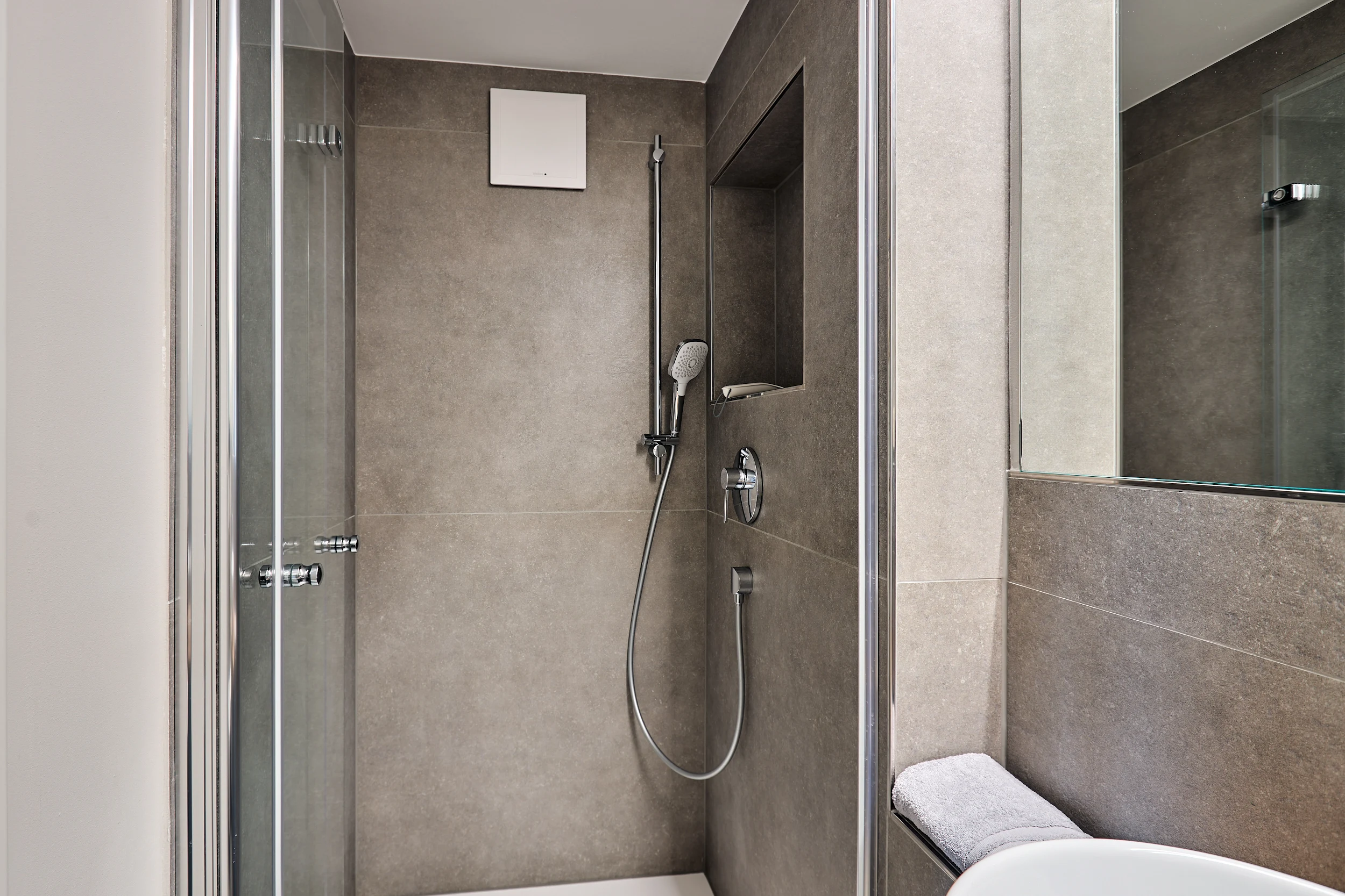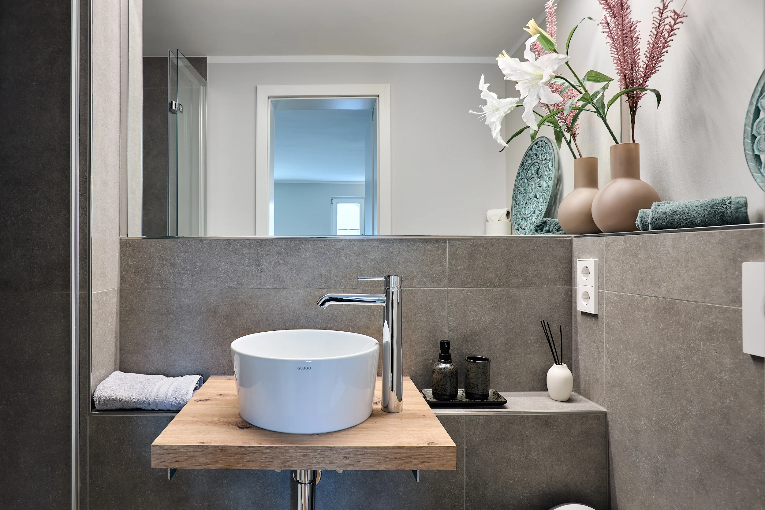 Das kleine, gepflegte Badezimmer ist funktional, stilvoll und rundet das Studio harmonisch ab.