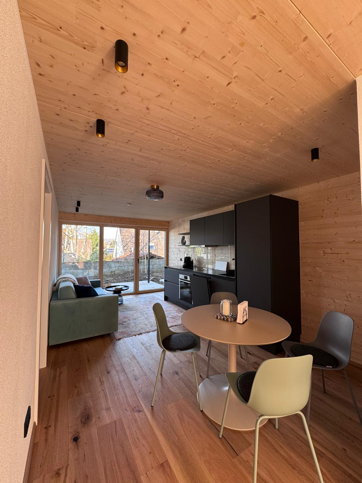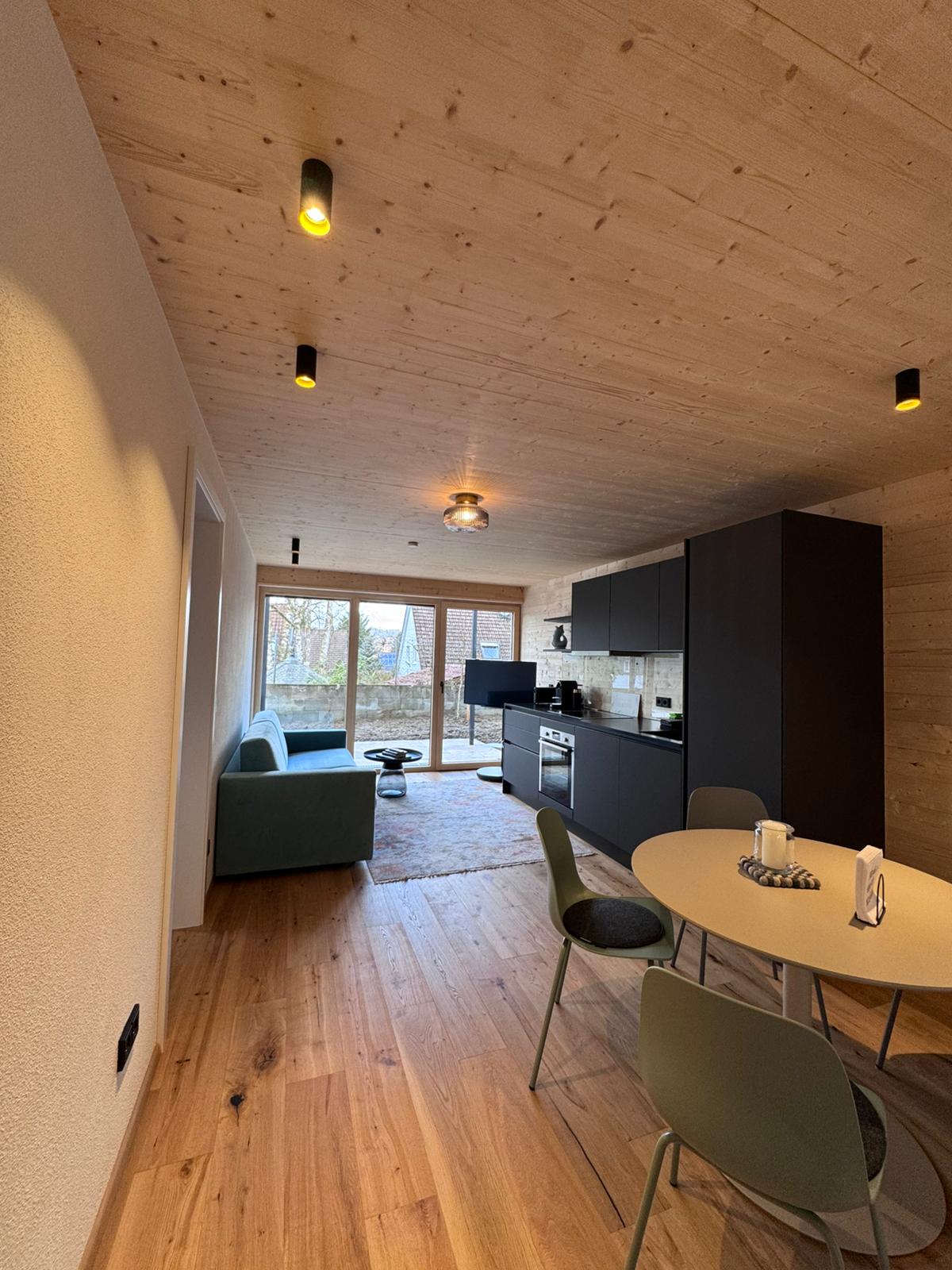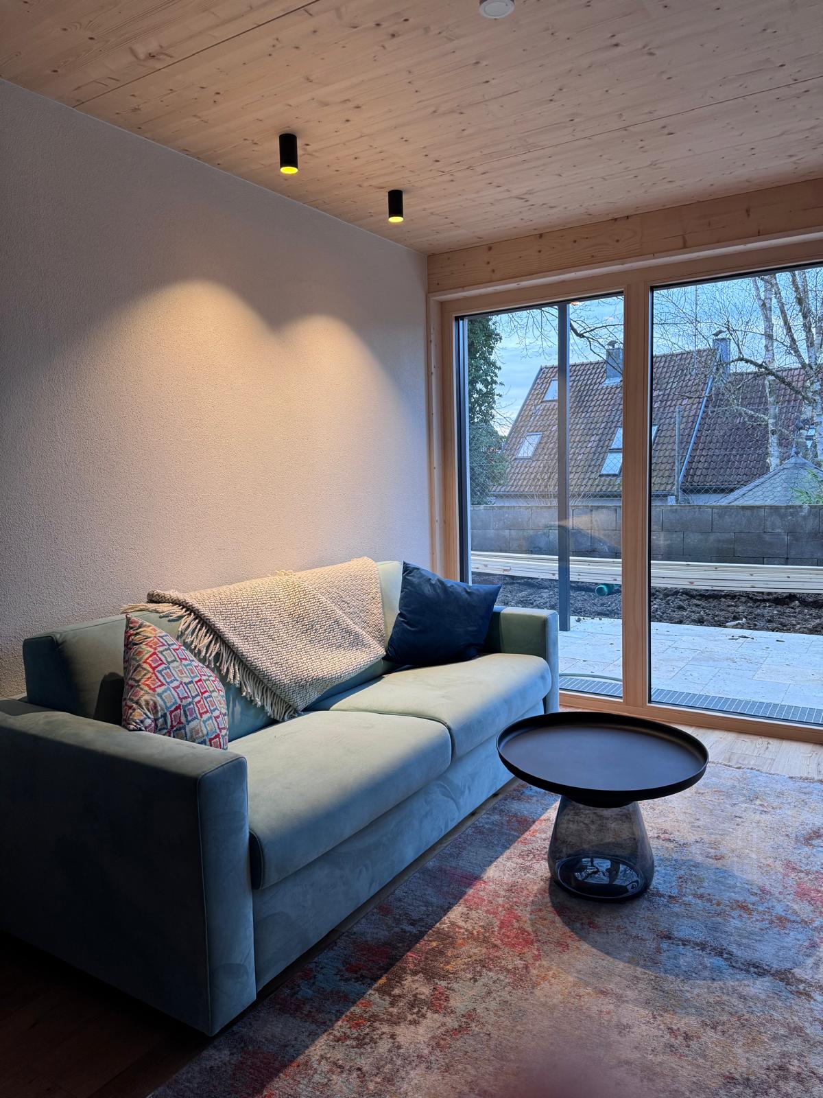 Durch die großen Fenster fällt das Licht sanft in die Räume, und die private Terrasse mit Blick ins Grüne wird schnell zum Lieblingsplatz – für Frühstück im Morgentau oder laue Sommerabende unter freiem Himmel.