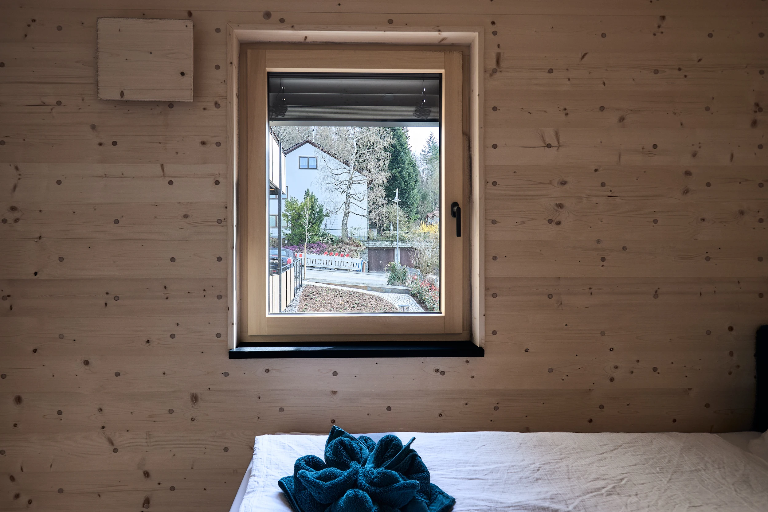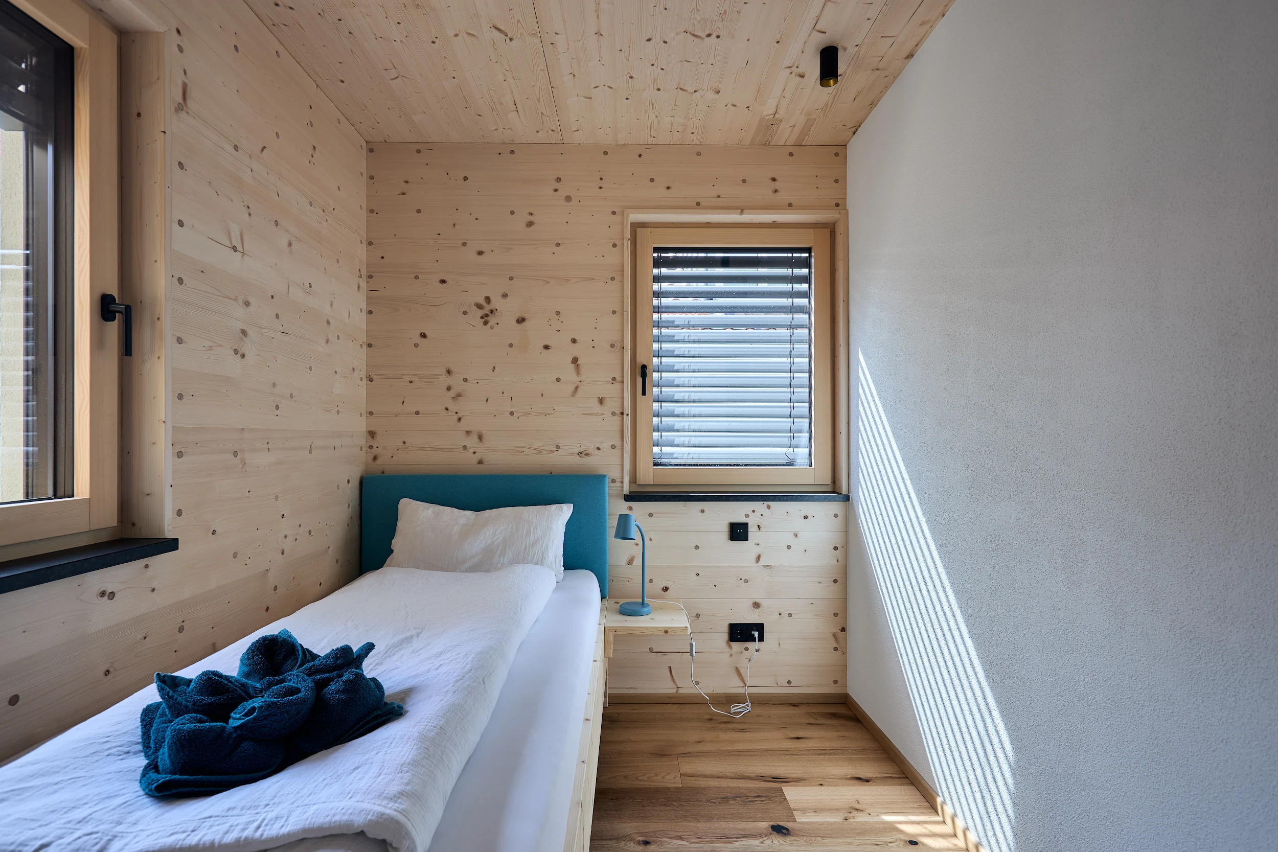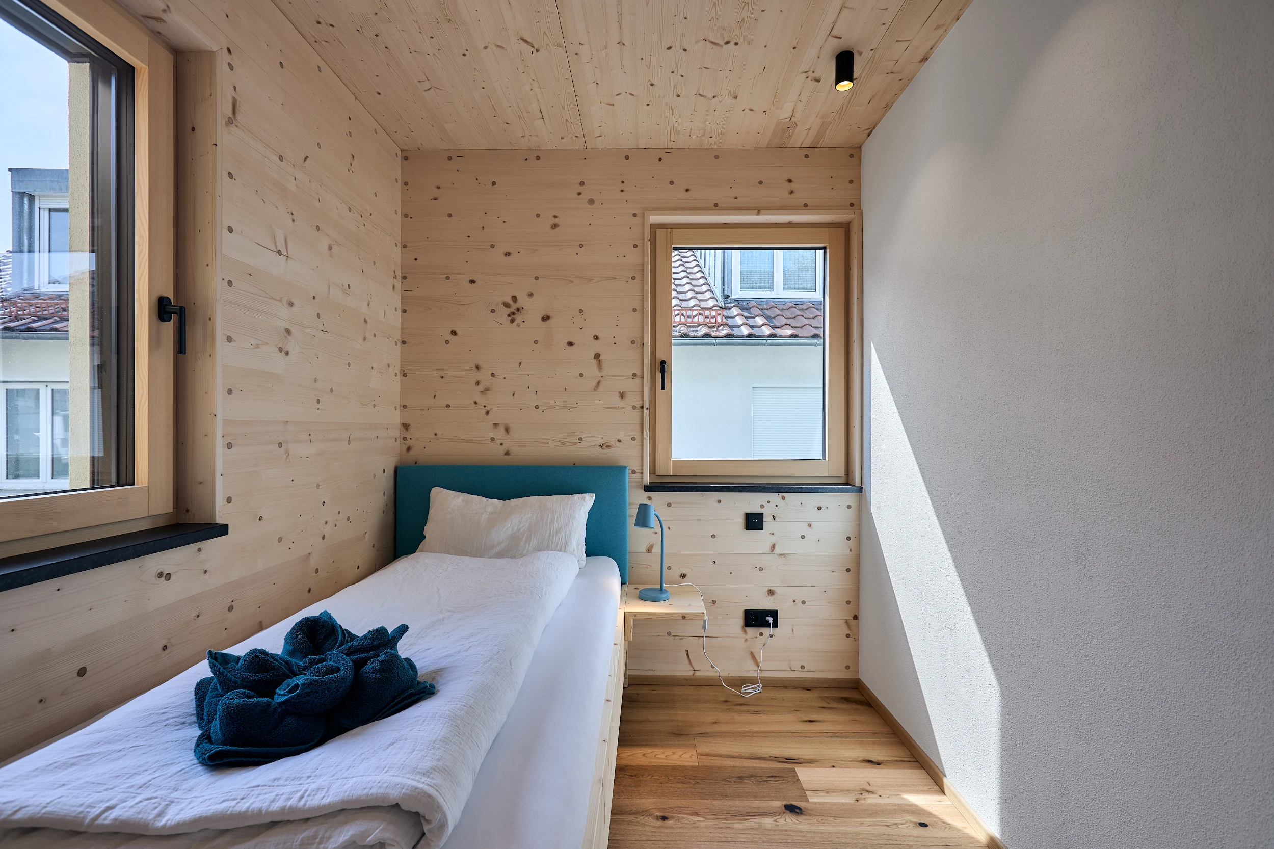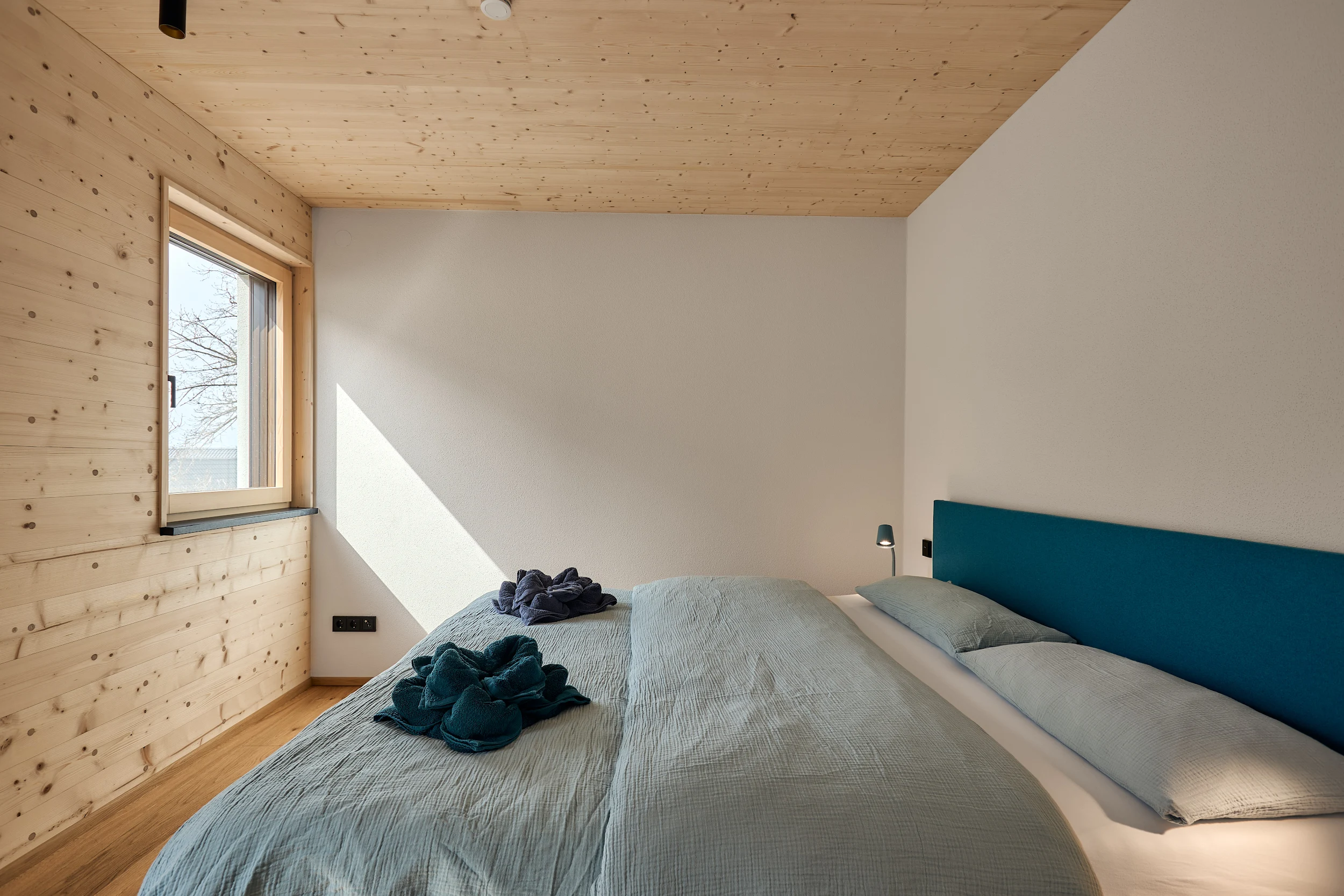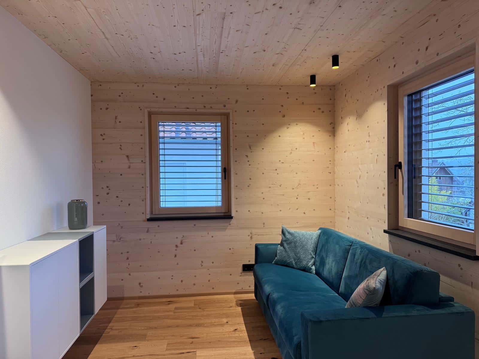 Die massive Holzkonstruktion reguliert das Raumklima auf natürliche Weise. Angenehm kühl im Sommer, wohlig warm im Winter. Schutz vor Lärm und Strahlung für erholsame Nächte.