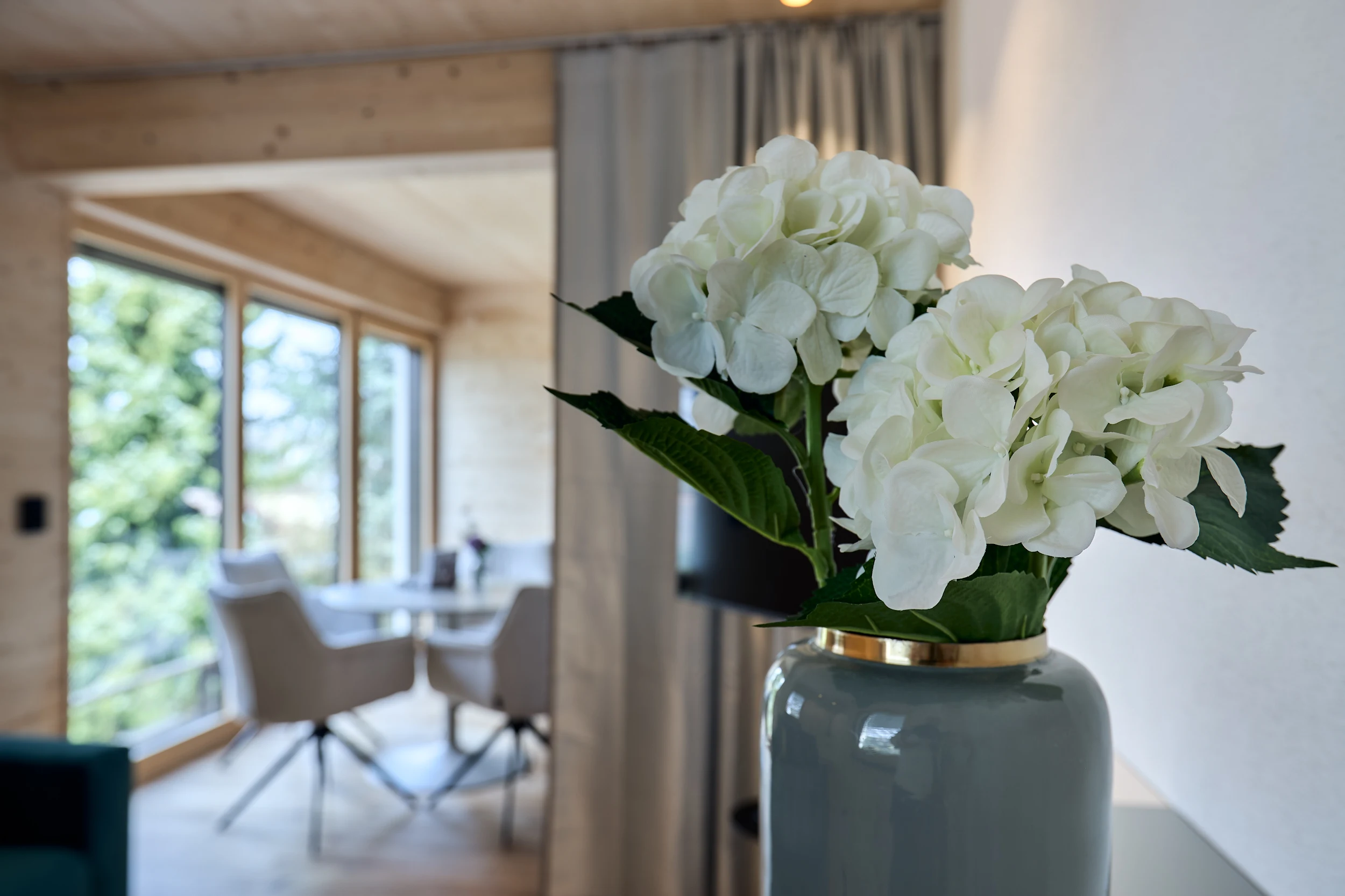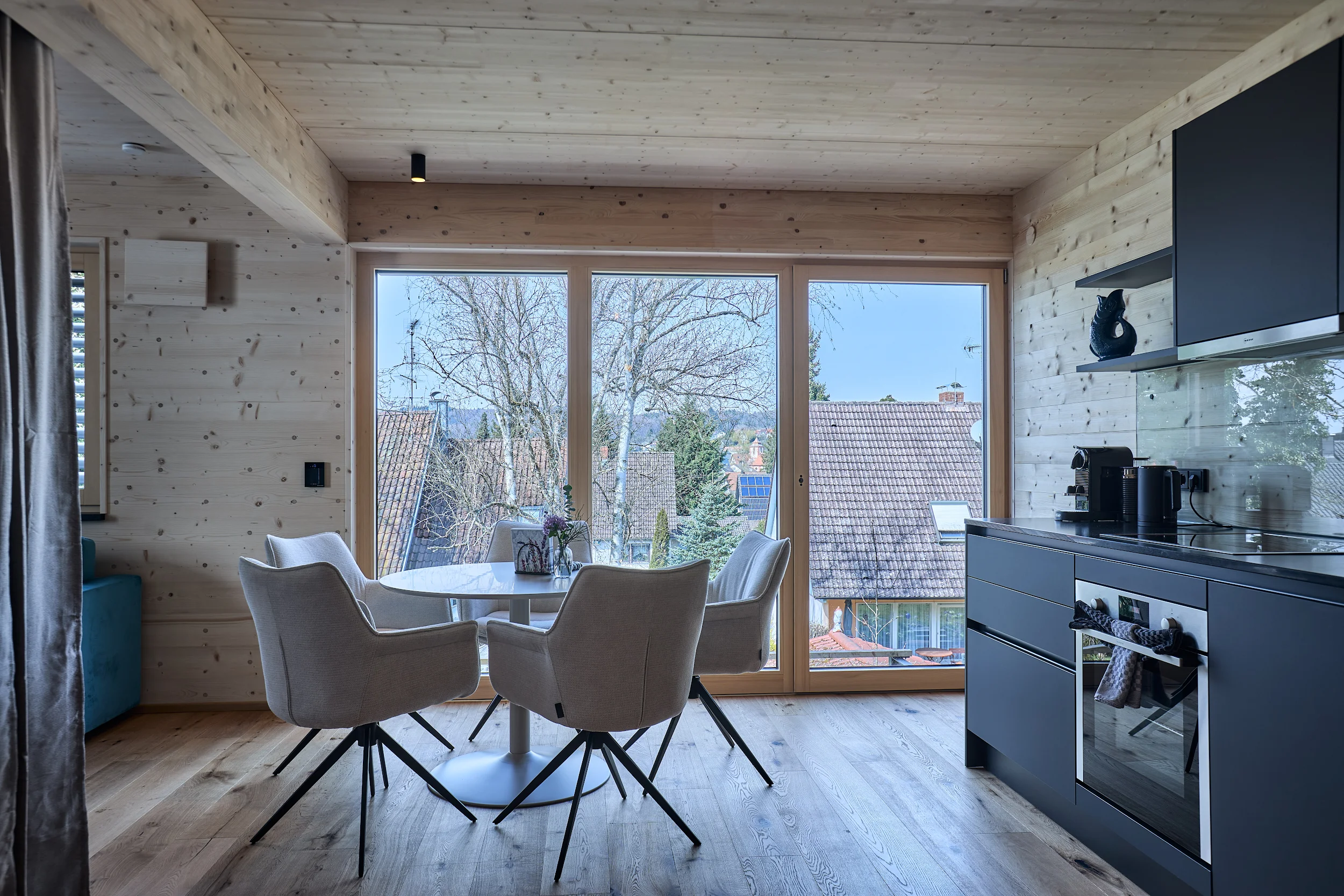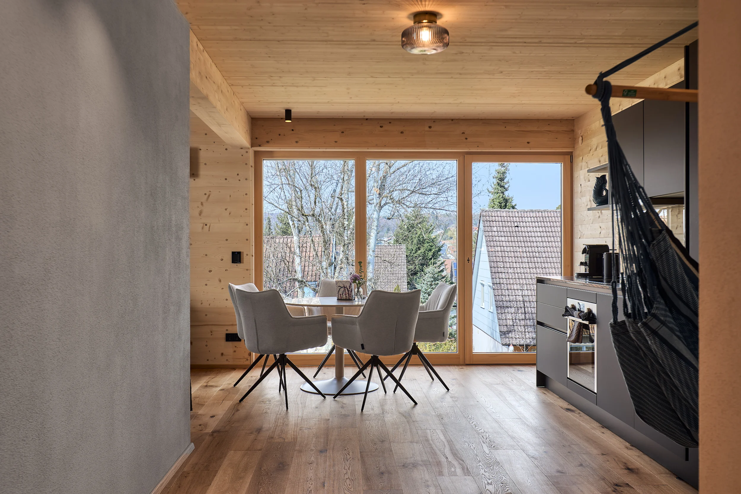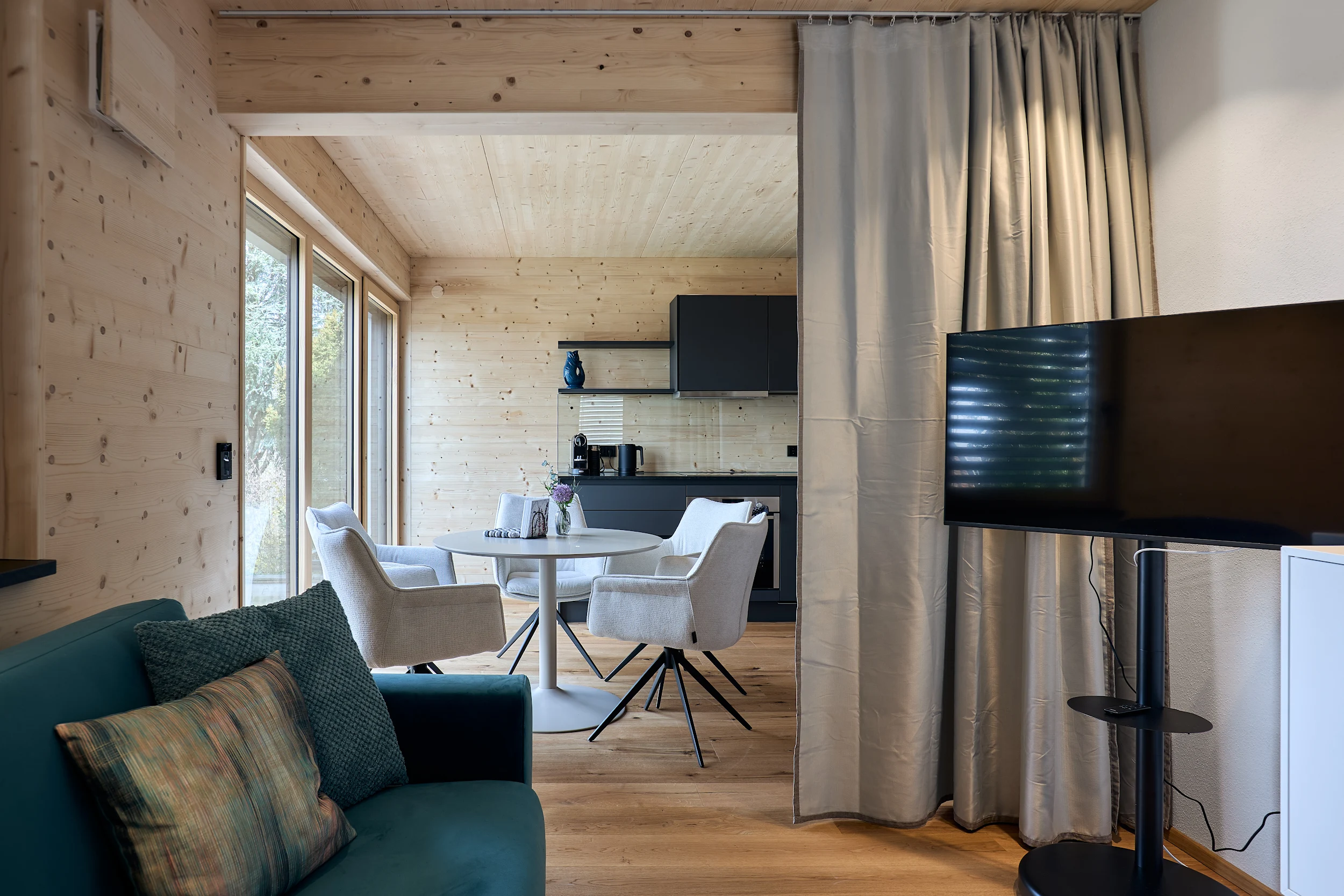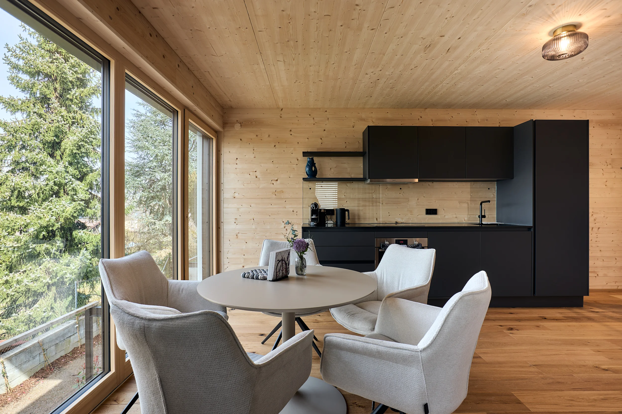 Die massive Holzkonstruktion reguliert das Raumklima auf natürliche Weise. Angenehm kühl im Sommer, wohlig warm im Winter. Schutz vor Lärm und Strahlung für erholsame Nächte.